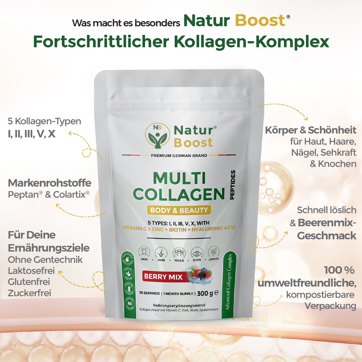 Multi Kollagen Komplex 5 Typen (I-X) mit Peptan & Colartix | Hyaluron, Biotin, Zink & Vitamin C | Wildbeere Pulver: Haut, Haare, Nägel, Sehkraft & Knochen | 300g (30 Port.) | Made in EU