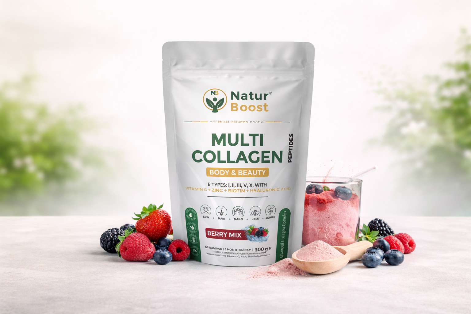 5 Kollagen-Typen Enthält fünf essenzielle Kollagen-Typen für eine ganzheitliche Unterstützung des Körpers.