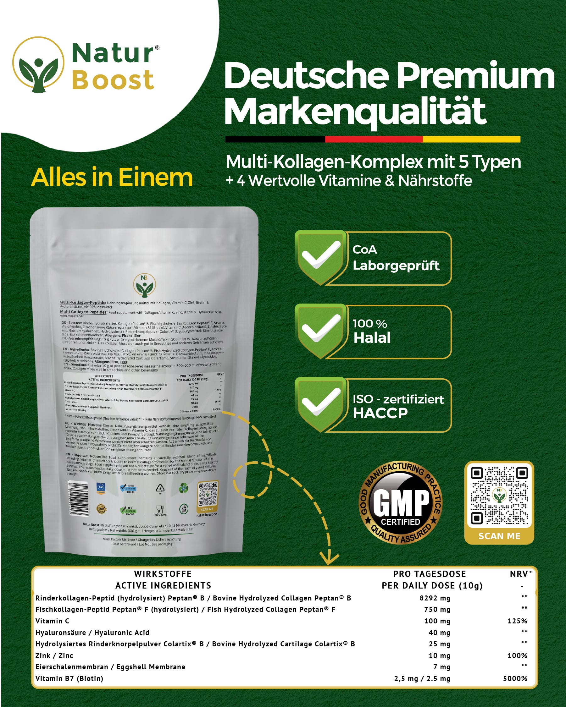 Multi Kollagen Komplex 5 Typen (I-X) mit Peptan & Colartix | Hyaluron, Biotin, Zink & Vitamin C | Wildbeere Pulver: Haut, Haare, Nägel, Sehkraft & Knochen | 300g (30 Port.) | Made in EU